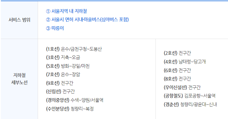 서울 시내에서 승차하고 서울 또는 경기, 인천 등 인근 지역에서 하차하는 경우에 이용 가능합니다. 단, 신분당선처럼 기본요금이 다른 노선은 제외되며, 대중교통 무제한 카드 기후동행카드는 서울이 아닌 다른 지역에서의 승차는 불가능합니다.