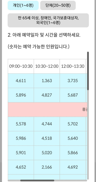- 지시에 따라 원하는 날짜, 시간, 방문 인원 수 등의 정보를 입력합니다.