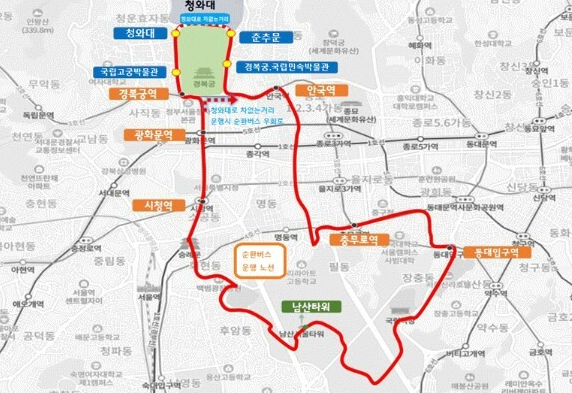 - 광화문 또는 종로 일대에서 버스를 이용하여 청와대 인근에 하차할 수 있습니다.