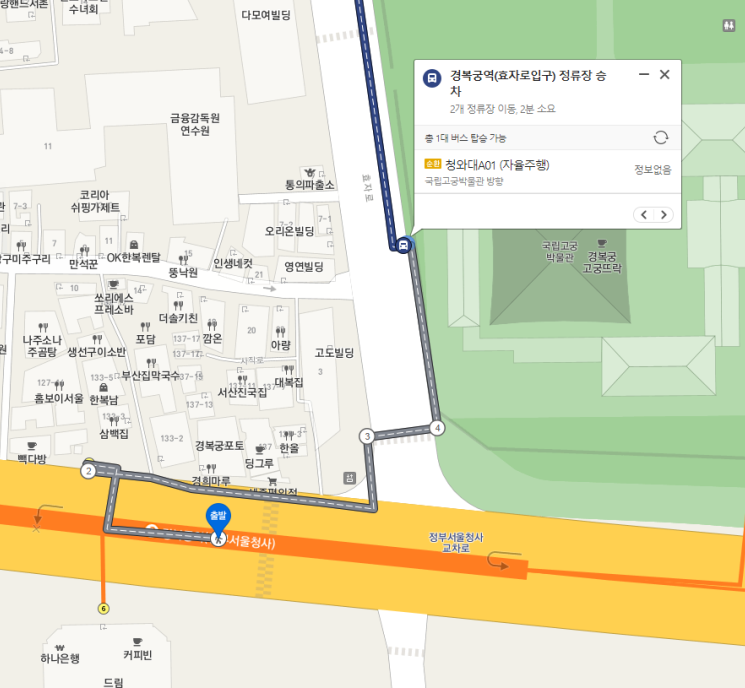 - 경복궁역에서는 2번 출구로 나와 도보로 약 20분 정도 소요됩니다.
