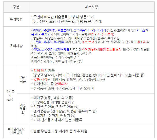 - 특정 설치가 필요한 제품: 벽에 고정된 에어컨, 내장형 오븐, 내장형 스토브 등 처음 설치 시 전문가에 의해 고정되거나 특별한 설치가 필요한 제품은 폐가전 무료수거가 어렵습니다.